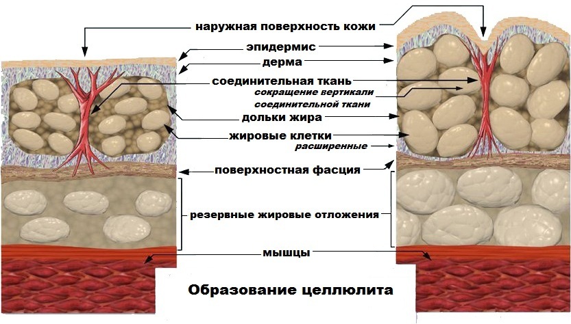 Локальная гипертрофия жировых клеток и нарушения крово- и лимфоoбращения приводят к венозному застою и лимфостазу; формируется отек, вызывающий фиброз и далее склероз тканей. В развитии болезни следует выделить нарушение равновесия между процессом липолиза и липогенеза вследствие гормональных и дисметаболических изменений в организме.
